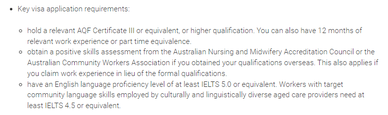 3、英語語言水平至少達到雅思 5.0 或同等水平,受文化和語言多元化的老年護理機構雇用的具有目標社區語言技能的工作人員需要雅思至少 4.5 或同等水平。